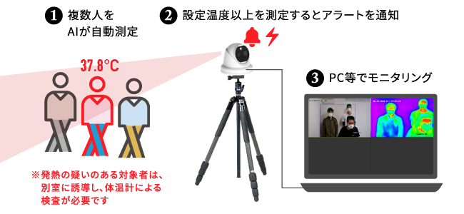 AI搭載で顔を検知し測定することで誤報を減らします。