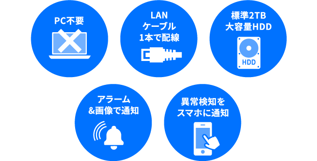 PC不要なので新たにPCを購入するコストもかかりません。また、通常PCで行うカメラ側の設定※も、レコーダーで設定ができます。